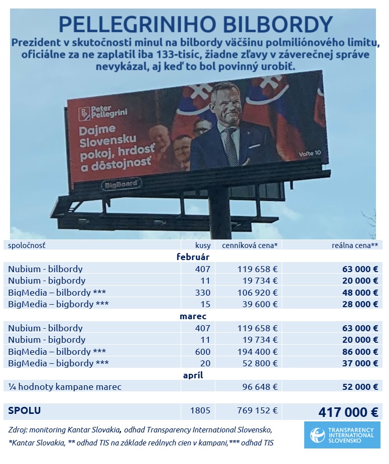 Najvýraznejšie bolo prekročenie vidno na bilbordovej kampani. Po započítaní reálnych zliav, ktoré mali politici v tom období, sme ju vyčíslili na 417-tisíc eur (viď obrázok). Aj keď bola Pellegriniho kampaň dvojnásobná oproti súperovi Ivanovi Korčokovi, zaplatil za ňu len polovicu a rozdiel vysvetľoval práve „výraznými zľavami“.