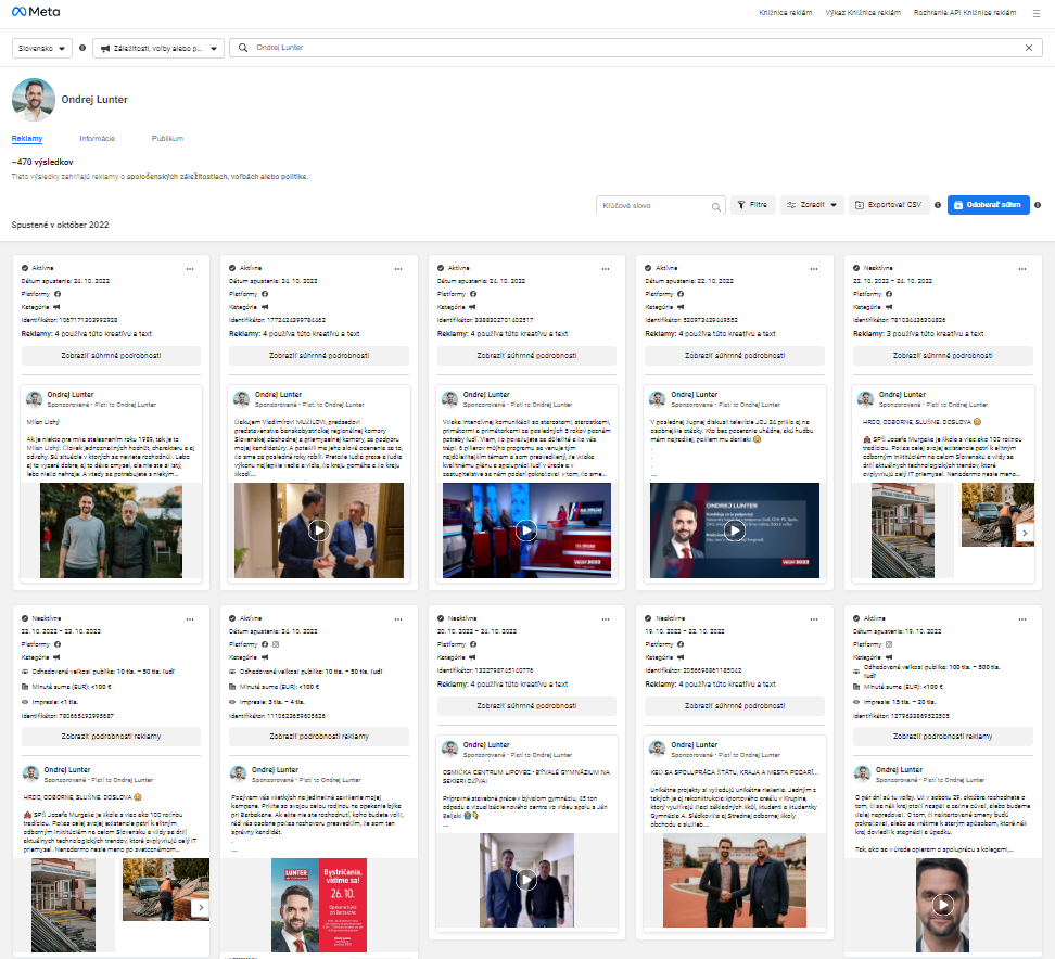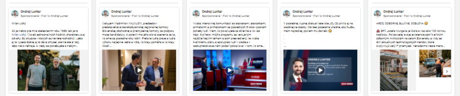 Aj nastávajúce miestne a župné voľby potvrdzujú trend presúvania kampaní do online priestoru. V spolupráci s technologickou spoločnosť Gerulata Technologies sme sa pozreli na facebookové stránky vyše stovky kandidátov na županov a primátorov v mestách nad 30-tisíc obyvateľov, ktorí voličov oslovovali aj cez sponzorované statusy. Počas kampane v priemere platili za 50 statusov. Najčastejšie, až 398-krát, pomáhal šíreniu svojich posolstiev kandidát na banskobystrického župana Ondrej Lunter. (Nejde o počet statusov, ale platieb, keďže kandidáti často šírenie úspešných či dôležitých statusov predlžujú alebo cielia na odlišné FB publiká).