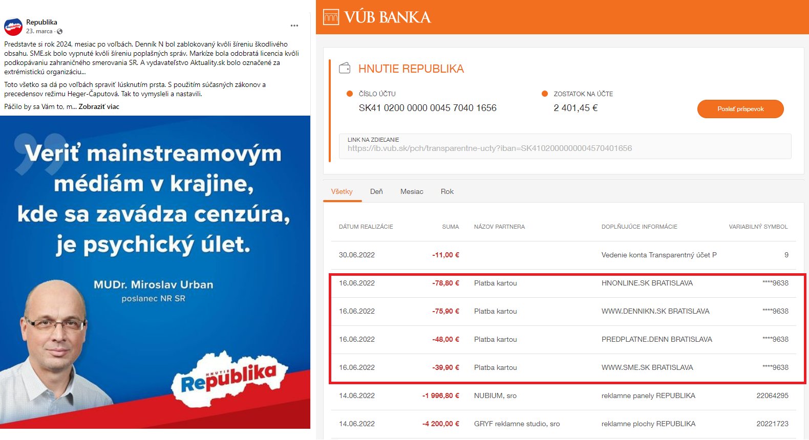 Republika je jedna z desiatich strán, ktorá si dosiaľ na ministerstva vnútra zaevidovala transparentný účet. Okrem Hlasu má na ňom dosiaľ najnižšie vklady – aktuálne cez 16-tisíc eur. Kotlebovci pre porovnanie na účte operujú so 63-tisícmi, Sme rodina s 330-tisícami, OĽaNO so 400-tisícmi a Smer s pol miliónom eur.