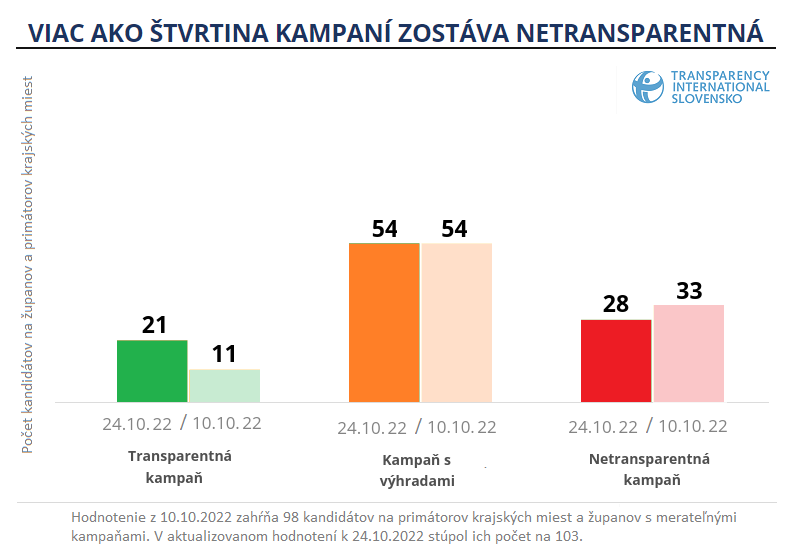 Krátko pred voľbami sme sa v Transparency International Slovensko (TIS) opäť pozreli na transparentnosť  kampaní v krajských mestách a samosprávnych krajoch. V  aktualizovanom hodnotení sa počet kandidátov vedúcich transparentnú kampaň  zdvojnásobil – je ich 21 z celkovo 103 hodnotených. V prvom hodnotení skončilo v najlepšej zelenej skupine len 11 z celkovo 98 hodnotených kandidátov. Ešte stále je však viac ako štvrtina kandidujúcich politikov netransparentných (aktuálne 28) a pri polovici kampaní (54) prevládajú výhrady. Celková transparentnosť sa za dva týždne zdvihla len nepatrne (zlepšenie skóre z 49,7% na 52,8%).