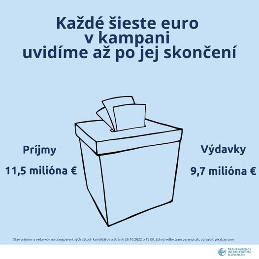 Pár hodín do konca kampane majú kandidáti na primátorov a županov na transparentných účtoch ešte stále neminuté každé šieste euro. Aktuálne príjmy na účtoch vyše päťsto kandidátov, ktoré vizualizujeme na portáli VOLBY.TRANSPARENCY.SK, dosahujú už cez 11,5 milióna eur. Výdavky sú zhruba o 1,8 milióna eur nižšie. Kam šli tieto peniaze tak verejnosť uvidí až po skončení kampane či dokonca po voľbách.